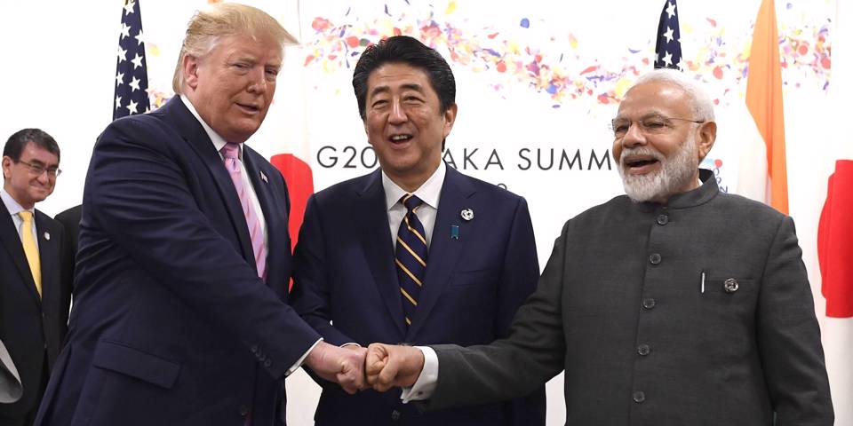 OSAKA, JAPAN – JUNE 28: U.S President Donald Trump does a fist bump with Japan’s Prime Minister, Shinzo Abe, and India’s Prime Minister, Narendra Modi, during a trilateral meeting on the first day of the G20 summit on June 28, 2019 in Osaka, Japan. U.S. President Donald Trump arrived in Osaka on Thursday for the annual Group of 20 gathering together with other world leaders who will use the two-day summit to discuss pressing economic, climate change, as well as geopolitical issues. The US-China trade war is expected to dominate the meetings in Osaka as President Trump and China’s President Xi Jinping are scheduled to meet on Saturday in an attempt to resolve the ongoing the trade clashes between the world’s two largest economies. (Photo by Carl Court/Getty Images)